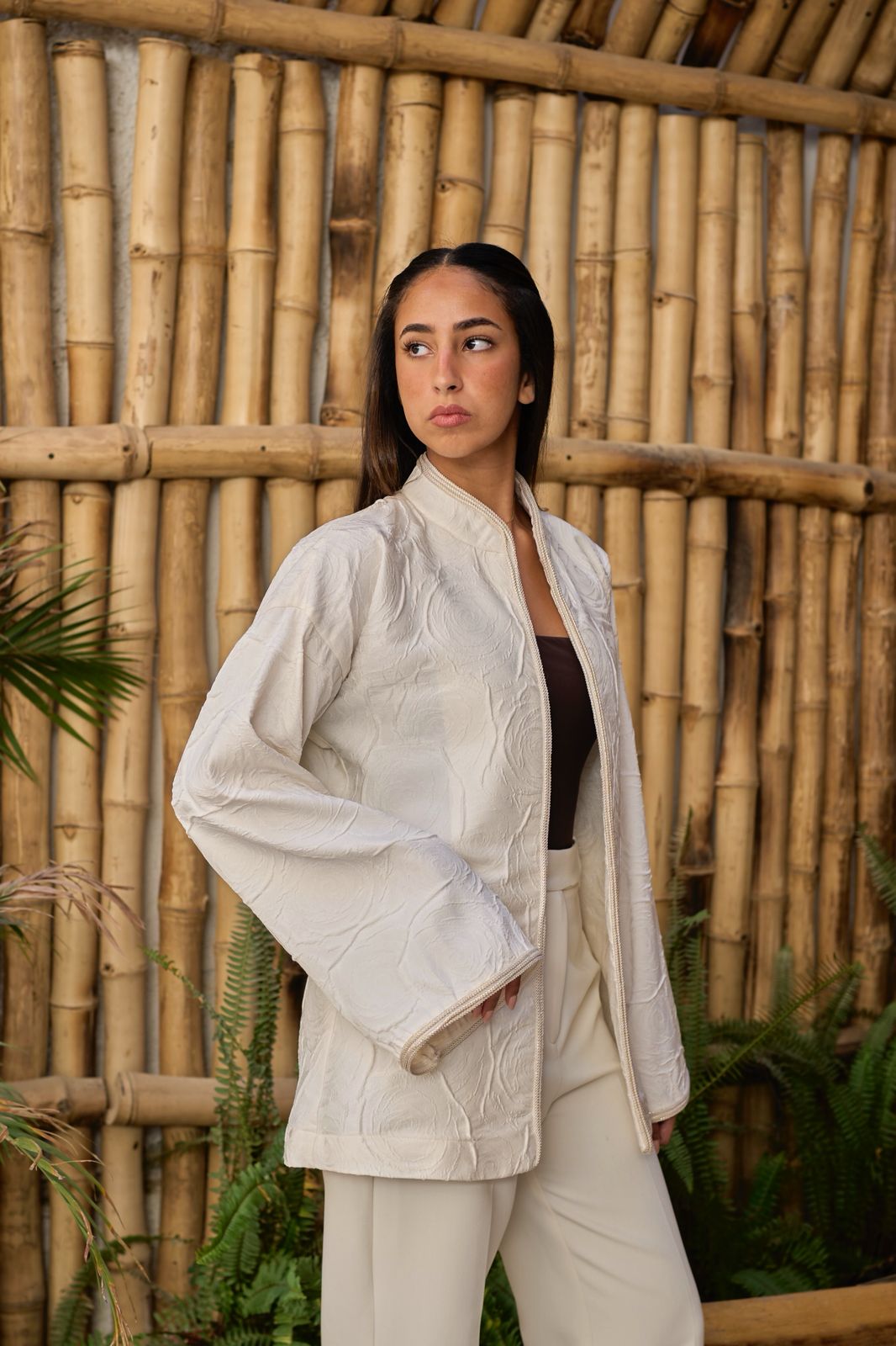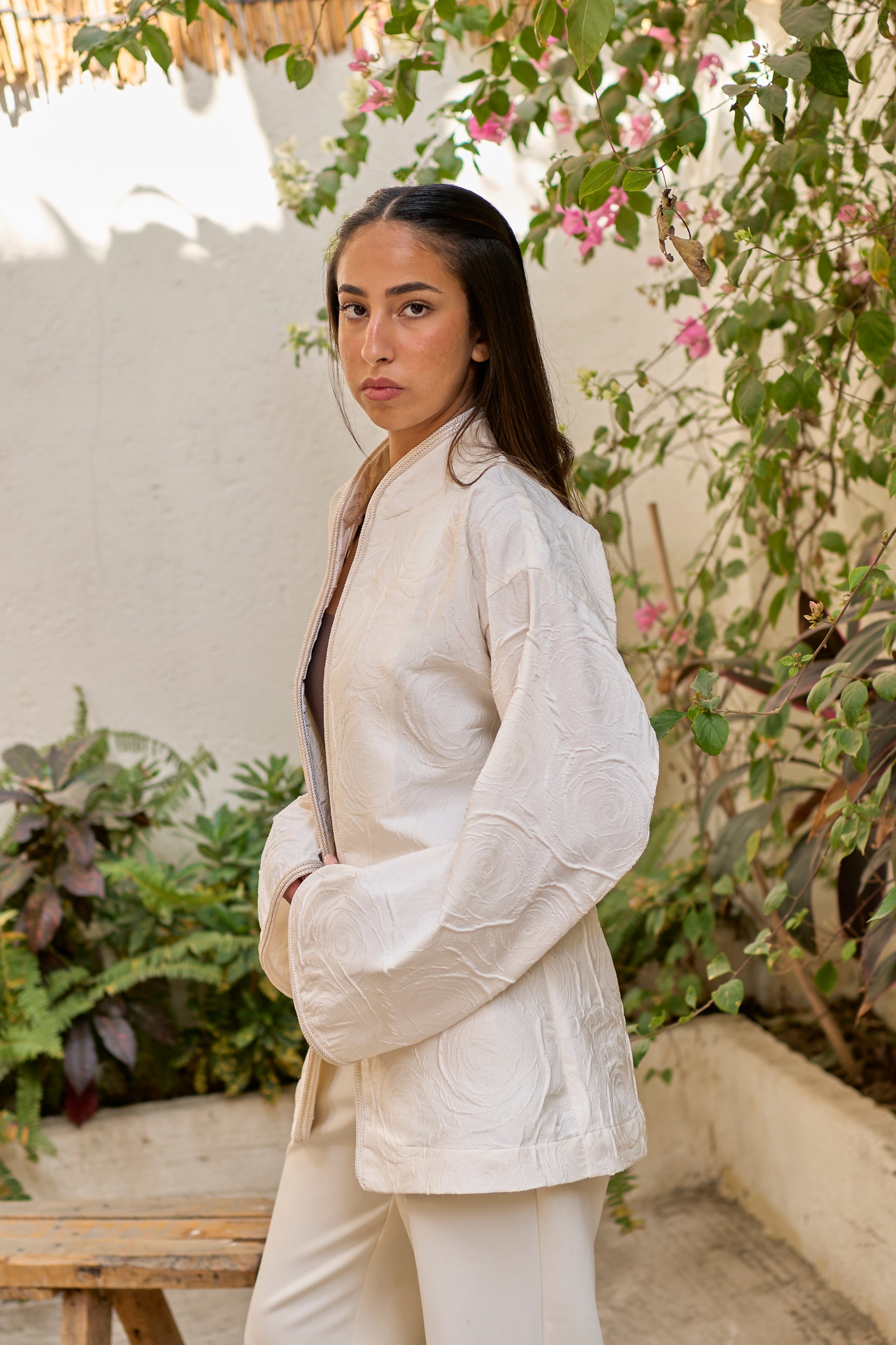 A lightweight off-white cardigan with delicate textured lines for a refined, classic look. An elegant layer, it's the perfect finishing piece for elevated styling.